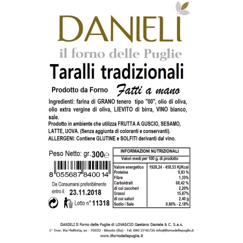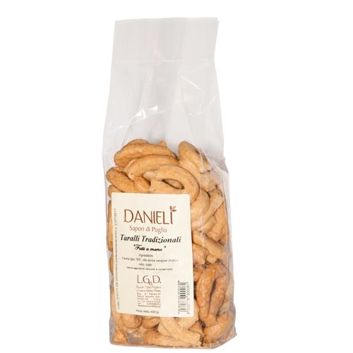 TARALLI TRADIZIONALI ALL’OLIO EXTRAVERGINE DI OLIVA, rigorosamente prodotti a mano come da antiche tradizioni.
