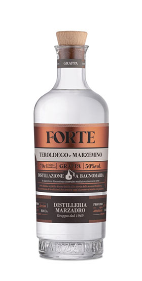 Grappa ottenuta da due vitigni autoctoni del Trentino a bacca rossa, Teroldego e Marzemino. La distillazione avviene lentamente con metodo a Bagnomaria in alambicco discontinuo a vapore, ciò preserva tutte le sostanze aromatiche dei vitigni, garantendo il massimo risultato in termini di aromi e profumi. Le vinacce di Teroldego derivano da uve coltivate nella Piana Rotaliana, zona vocata alla produzione di questa varietà autoctona. Le vinacce di Marzemino provengono da uve coltivate nelle zone collinari e sub-collinari della Vallagarina (basso Trentino), sulla riva destra del fiume Adige, comprese tra i comuni di Nomi, Mori ed Isera, habitat di eccellenza per questo tipico vitigno. Con l'esperta unione di queste due varietà otteniamo “Forte”, Grappa dal profumo deciso e di struttura ricca, estremamente persistente, robusta e avvolgente.