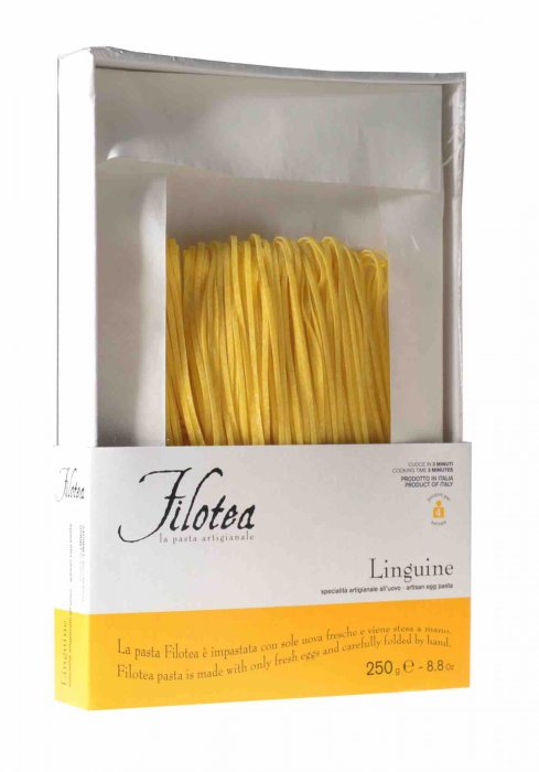 Le Linguine Filotea si gustano alla perfezione con un ragù di pesce bianco o rosso, oppure con il classico pesto genovese. Stese a mano su ogni confezione ed essiccate a basse temperature per almeno 24 ore, si caratterizzano per leggerezza e digeribilità.