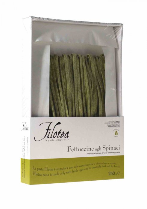 Le Fettuccine sono un formato di pasta all'uovo tradizionale della cucina italiana. Filotea ne produce una versione aromatizzata agli spinaci che donano loro un caratteristico colore verde e le rendono particolarmente adatte ad un sugo di pomodoro semplice o ad un ragù di verdure.