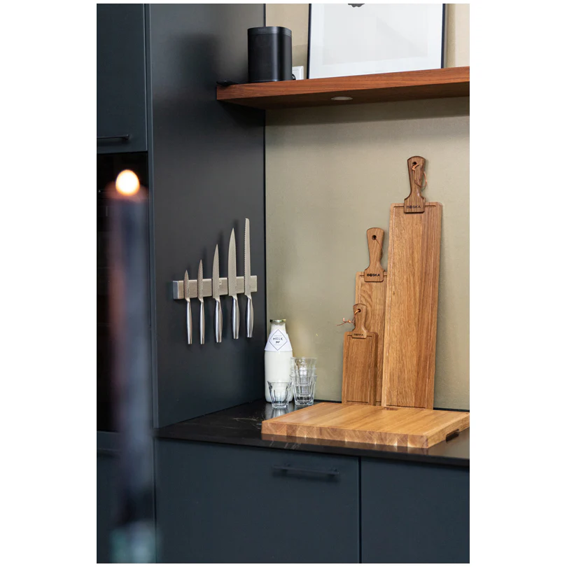 La forte barra magnetica Mr. Magneto è un'aiutante elegante e pratico in qualsiasi cucina. È adatta per appendere quasi tutti i tipi di coltelli da cucina. Grazie al design ingegnoso, c'è spazio extra tra il muro e la barra magnetica in modo tale da poter afferrare i coltelli con un movimento fluido. La robusta barra magnetica è realizzata in acciaio inossidabile di alta qualità e presenta sul davanti la tipica struttura della linea Monaco+. Riporre i coltelli su una barra magnetica è più sicuro rispetto alla tradizionale conservazione nel cassetto della cucina. Inoltre, i coltelli rimangono affilati più a lungo. Pulirla con un panno umido.