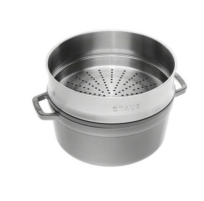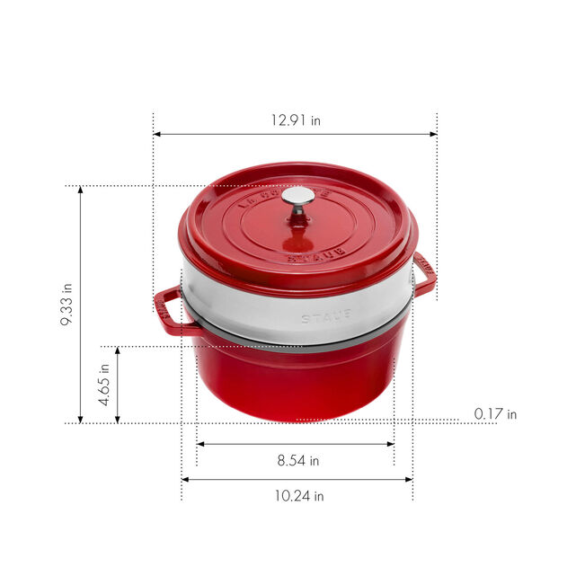 Free shippingLa cocotte di STAUB in un'elegante tonalità di rosso combina l'artigianato tradizionale con la funzionalità moderna per un piacere unico. Peperoni ripieni, involtini di cavolo, ratatouille mediterranea, dessert, pane fresco e molto altro: in questa pratica pentola in ghisa è possibile preparare un'ampia varietà di pietanze. Grazie a questo speciale materiale che richiede solo pochi grassi per la cottura e alla struttura unica della casseruola, i cibi risultano poveri di calorie ma ricchi di sostanze nutritive e sprigionano aromi invitanti. Lo strato di smalto interno nero opaco intensifica il gusto delle pietanze, mentre la ghisa garantisce una distribuzione ottimale del calore. Sia i cuochi professionisti che quelli dilettanti troveranno un aiutante durevole nella pentola in ghisa. La particolarità di questa cocotte è l'inserto per cottura a vapore, che consente di stufare e cuocere al vapore contemporaneamente sfruttando il vapore acqueo che sale.