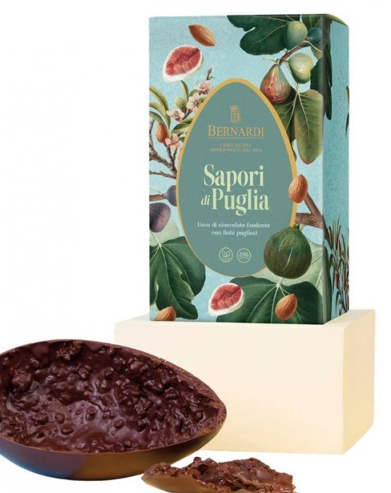 Da questa specialità prende vita un uovo raffinato, realizzato con pregiato cioccolato fondente al 60% e arricchito da fichi secchi pugliesi, che donano dolcezza naturale e una piacevole consistenza