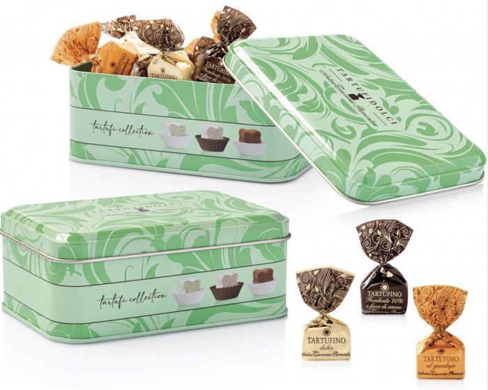 Una nuova raffinata Latta color Verde, dal design elegante e senza tempo, impreziosita da un delicato “Ramage” che ne esalta la bellezza, per tre dei nostri Tartufini Dolci. Il Tartufino Fondente al 70% con fave di cacao, un gusto che abbiamo ottenuto rafforzando il sapore deciso di sopraffino cioccolato contenente il 70% di cacao con fave di cacao grezzo; il Tartufino Dolce, l’Originale, con il suo impasto di Nocciole in perfetto equilibrio con il cioccolato più raffinato; infine, il Tartufino al Gianduja, un gusto tipicamente piemontese. Un piccolo lavoro di gusto e raffinatezza.