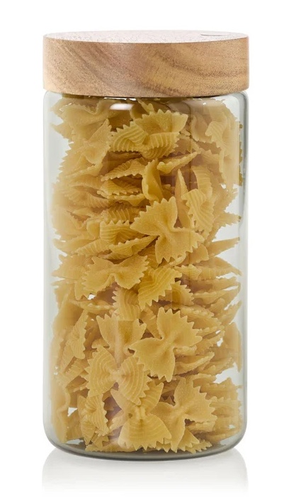 I barattoli, realizzati in vetro borosilicato soffiato, un materiale resistente al calore ed insapore, sono dotati di una chiusura SoftSeal, guarnizione in silicone inclusa. Chiudendo il coperchio, l'aria fuoriesce dal barattolo, preservando più a lungo l'aroma e la freschezza del contenuto. Il coperchio in legno di acacia non è lavabile in lavastoviglie.