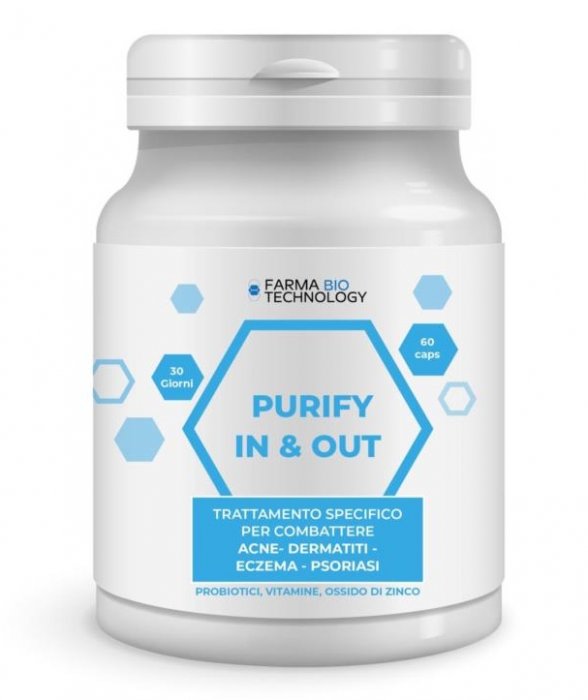 Purify In &Out è un integratore alimentare a base di Probiotici, Vitamine e Minerali utilizzati per purificare la pelle. Indicato come trattamento specifico per copmbattere Acne, Psoriasi, Dermatiti ed Eczema.
