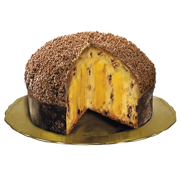 Panettone allo zabaione, senza canditi nè uvetta, con gocce di cioccolato e ricoperto di cioccolato fondente.