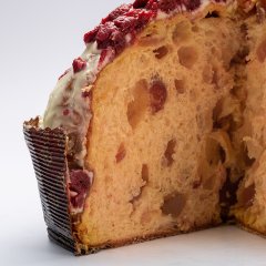 Ingredienti: farina di frumento macinata a pietra, farina di frumento tenero integrale, burro vaccino di Normandia, zucchero, tuorlo d’uova fresche, Lamponi, lievito naturale, miele d’acacia, sale, malto, baccelli di vaniglia del Madagascar. Glassa: Panna fresca, Cioccolato puro bianco, Strega Alberti, Lamponi.