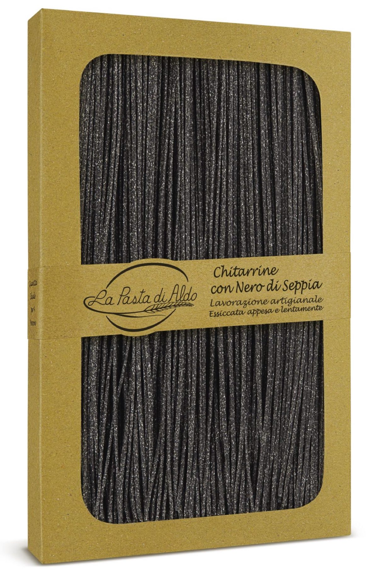 Sicuramente sono le Chitarrine più particolari. Di un nero intenso che seduce attraverso la finestrella di cellophan alimentare, sembrano voler balzare fuori dalla cornice in cartapaglia per immergersi subito nell’acqua di cottura e trionfare così in un nero ancora più brillante, un vero visibilio per gli occhi. Annusando il vapore di cottura si intuisce quell’impercettibile profumo di nero di seppia che le rende così originali. Esaltate con sughi bianchi a base di pesce, stanno benissimo anche con verdure e olio extra vergine di oliva. Da gustare per capire che la Pasta di Aldo è la Pasta all’Uovo.