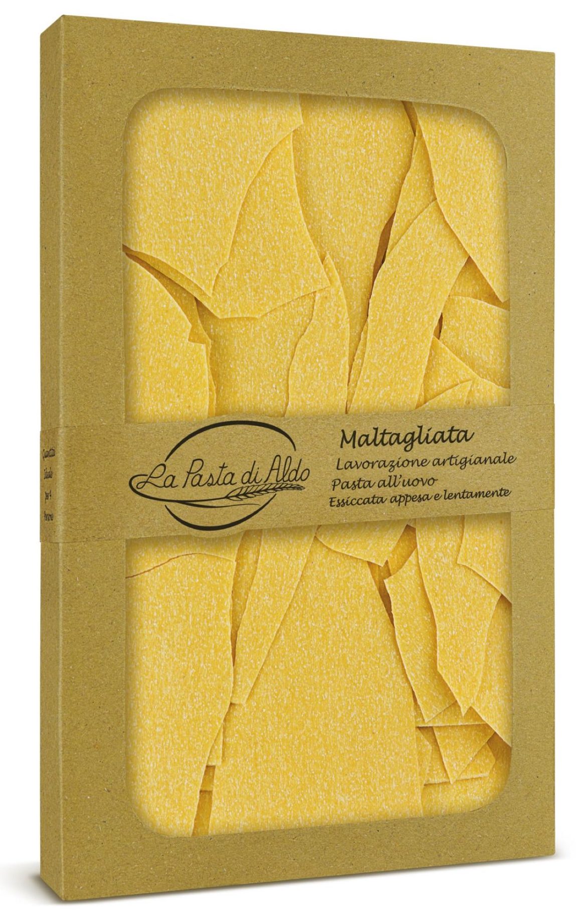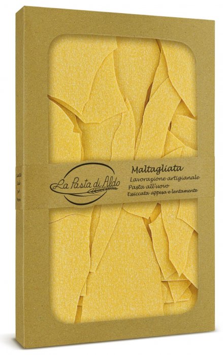 La Pasta Maltagliata è la nostra Pasta Corta. Forse la Pasta che meglio di ogni altra può offrire la base ideale per dare libero sfogo alla propria creatività in cucina. Pasticciata al forno come una lasagna; saltata in padella con un sauté di pesce oppure con un condimento più caratterizzante come potrebbe essere “funghi e salsiccia”. Per ridurre la sfoglia in frammenti ancora più piccoli basta sgretolarla delicatamente tra le mani ed ecco pronta la Maltagliata giusta per Pasta e Fagioli oppure per una colorata Zuppa di verdure e legumi. Da gustare per capire che la Pasta di Aldo è la Pasta all’Uovo.