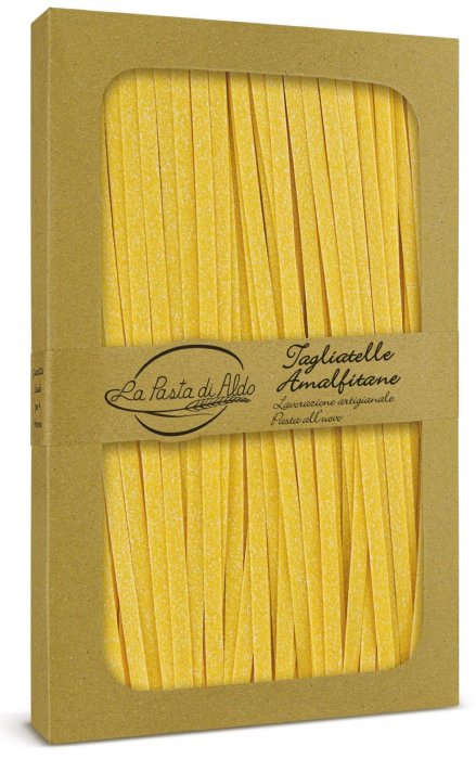 Le Tagliatelle Amalfitane sono il formato intermedio tra le Tagliatelle Classiche e le Pappardelle. Per alcuni le Tagliatelle Amalfitane sono le tagliatelle VERE, né troppo larghe né troppo strette. La misura ottimale per un bel piatto fumante di pasta all’uovo, magari profumato con ingredienti tipici della cucina Mediterranea come olive, capperi e pomodorini. Da gustare per capire che la Pasta di Aldo è la Pasta all’Uovo.