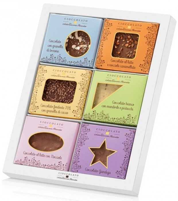 GUSTI: Cioccolato al latte con nocciole, cioccolato con granella di torrone, cioccolato al latte e nocciole caramellate, Gianduja, cioccolato bianco con mandorle e pistacchi, cioccolato fondente al 70% con granella di cacao.