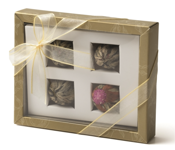 Foglie di tè compresse. Una selezione di 4 differenti tipi di Tè verdi cinesi compressi in nido. L’infusione regala l’incredibile sbocciatura di un fiore e può essere ripetuta 3 o 4 volte!