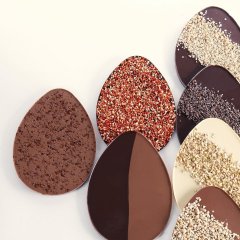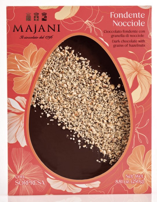 Un uovo piatto di finissimo cioccolato al latte extra con granella di nocciole. Con sorpresa. Cacao min. 53% Nocciole 8%.